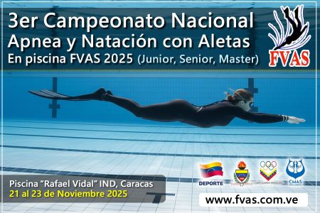 (Sportalsub.net / FVAS) La Federación Venezolana de Actividades Subacuáticas (FVAS) llevará a cabo el 3ER CAMPEONATO NACIONAL DE APNEA Y NATACIÓN CON ALETAS EN PISCINA del 21 al 23 de noviembre de 2025 en la piscina Rafael Vidal del IND, Caracas.  CONVOCATORIA OFICIAL Publicada el 23 de octubre de 2025  PRE-INSCRIPCIÓN APNEA  PRE-INSCRIPCIÓN NATACIÓN CON ALETAS Hasta el sábado 15 de noviembre […]