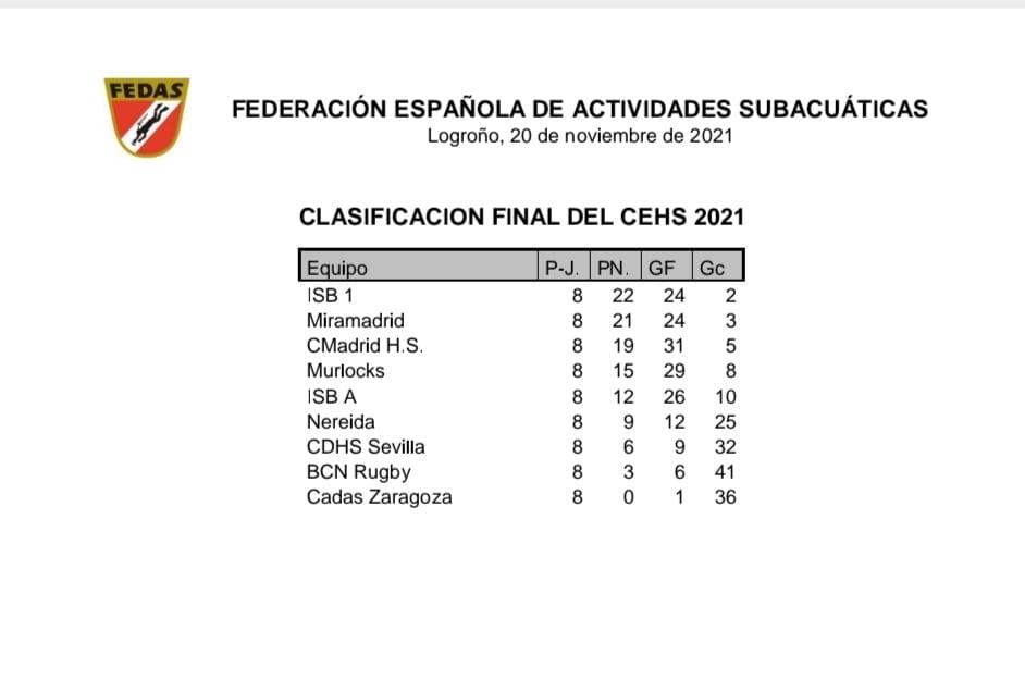 El sábado 20 de noviembre se celebró en el Centro de Tecnificación Deportiva Adarraga de Logroño, el Campeonato de España de Hockey Subacuático 2021. Los encuentros fueron retransmitidos a través de streaming en el canal YouTube FEDAS