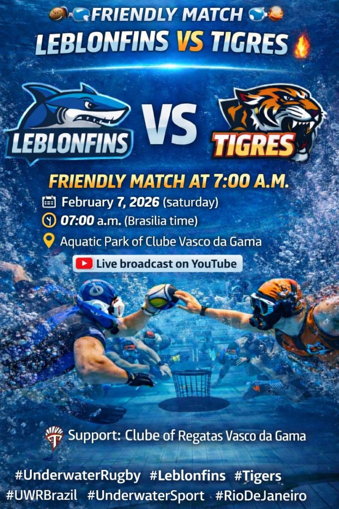 Next Saturday, February 7th 2026, starting at 7:00 AM (Brazil time), the pool at the Vasco da Gama Aquatic Park in Rio de Janeiro will host a high-intensity clash. The Leblonfins and Tigres teams will face off in a friendly match that promises to demonstrate why underwater rugby is gaining popularity in Brazil.